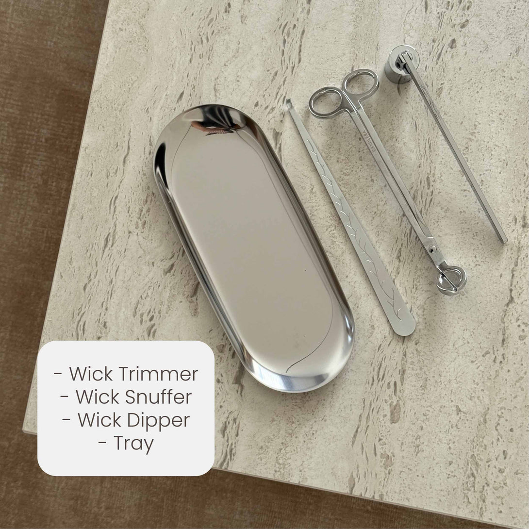 - Candle Care Set including a tray, wick trimmer, snuffer, and dipper.