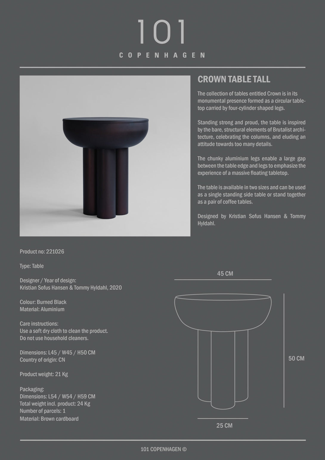 The Crown Table, Tall - Burned Black by 101 Copenhagen is a commanding piece that combines architectural sophistication with minimalist design. Designed by Kristian Sofus Hansen & Tommy Hyldahl, this table features a round tabletop supported by four substantial cylindrical legs, drawing inspiration from Brutalist architecture and its celebration of raw, structural elements. The wide spacing between the tabletop and legs creates a striking floating effect, making the table both a functional piece and a sculptural focal point. The hand-finished burned black aluminum brings warmth and depth to the table’s robust form, perfect as a side table or a standalone accent.